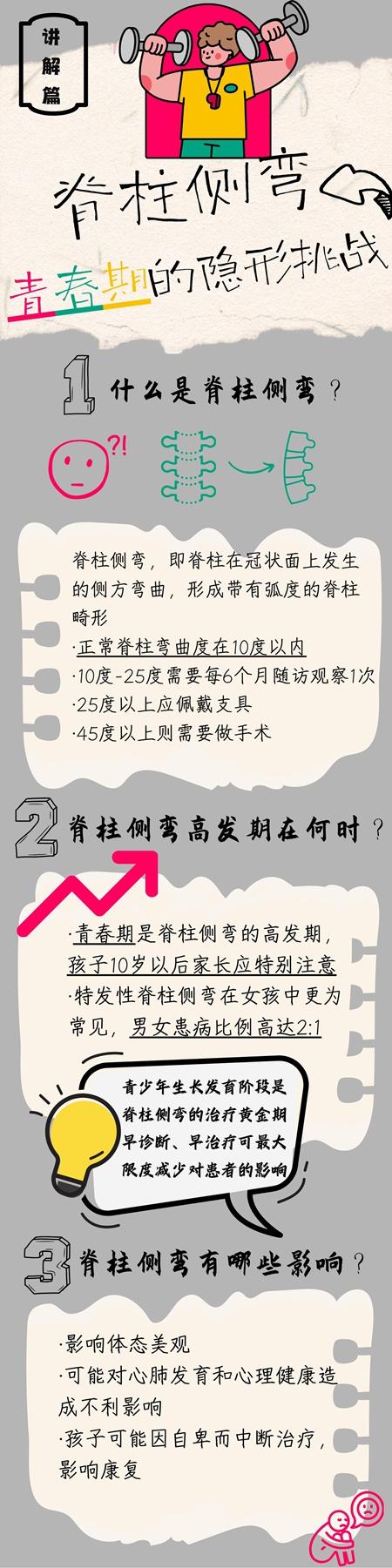 “近年来,随着学校和家长对青少年健康的日益关注,脊柱侧弯的体检和筛查也逐渐受到重视。在一些学校的体检中,脊柱侧弯筛查已被纳入常规项目。通过专业的体检,医生能够准确测量脊柱的弯曲程度,从而判断是否存在脊柱侧弯以及侧弯的严重程度,患儿能够在青春期得到及时治疗。”然而,据刘振江与其他骨科大夫的临床实际经验来看,并非所有学校都进行了脊柱侧弯筛查,尤其是一些偏远或医疗资源匮乏的地区,学校体检可能不包括这一项目。