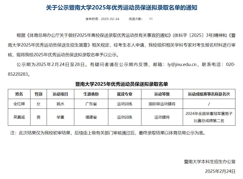 2月24日,暨南大学公示2025年优秀运动员保送拟录取名单通知,全红婵在列。拟录取名单显示,跳水运动员全红婵拟就读运动训练专业,运动等级为国际级运动健将。 公示期为2月24日至28日。