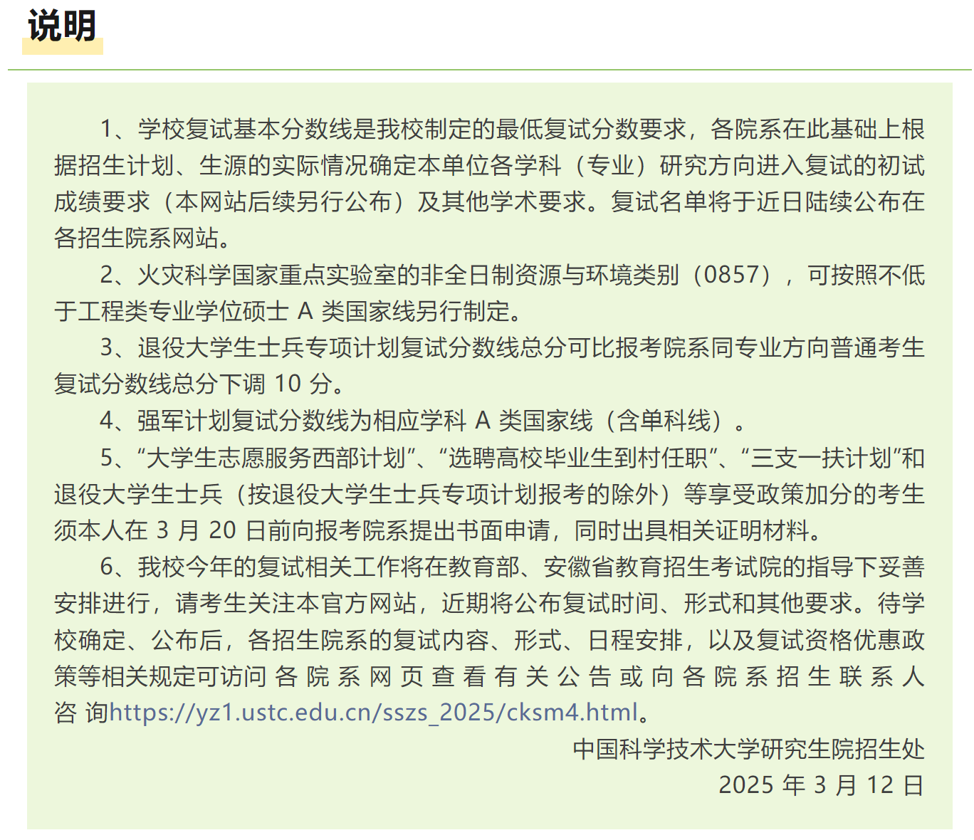 经学校研究生招生工作领导小组审议批准,现将我校2025年硕士研究生招生考试考生进入复试的初试成绩基本要求和有关说明公布如下: