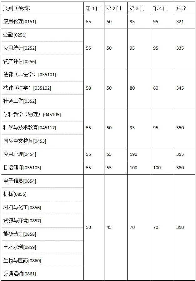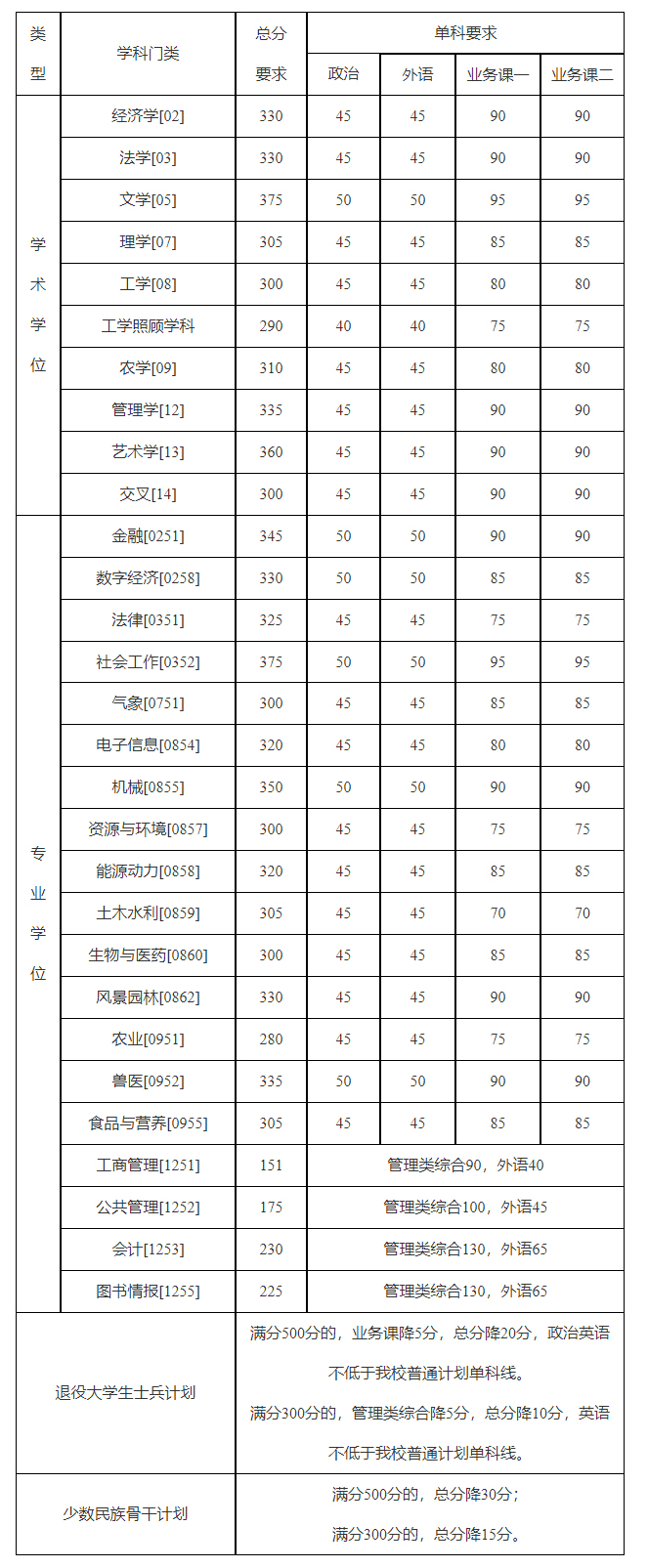 其中面向西藏地区“公共管理人才培养计划”专项,满分100分的单科成绩不低于40分、满分200分的单科成绩不低于90分、总分不低于160分;面向新疆喀什地区医学硕士专项,总分不低于235分,各单科成绩不作要求。