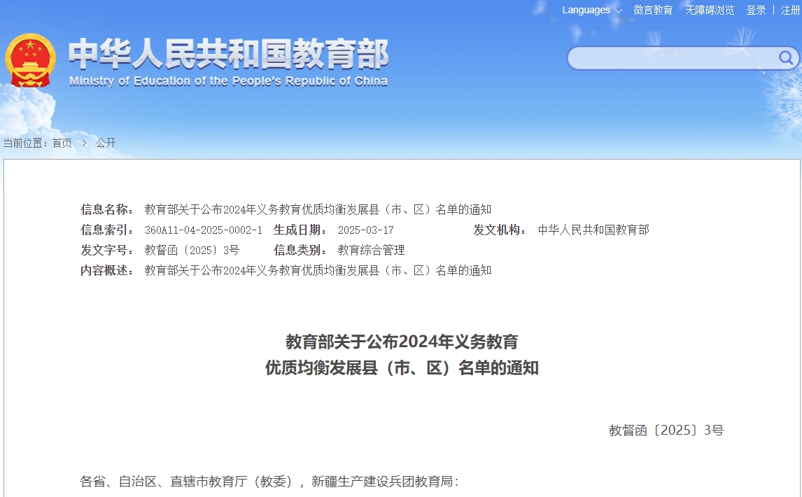 经组织开展资格审查、质量监测、社会认可度调查、指标审核、核查评估等国家督导评估认定程序,近日,教育部印发通知,决定认定天津市和平区等188个县(市、区)为2024年义务教育优质均衡发展县。