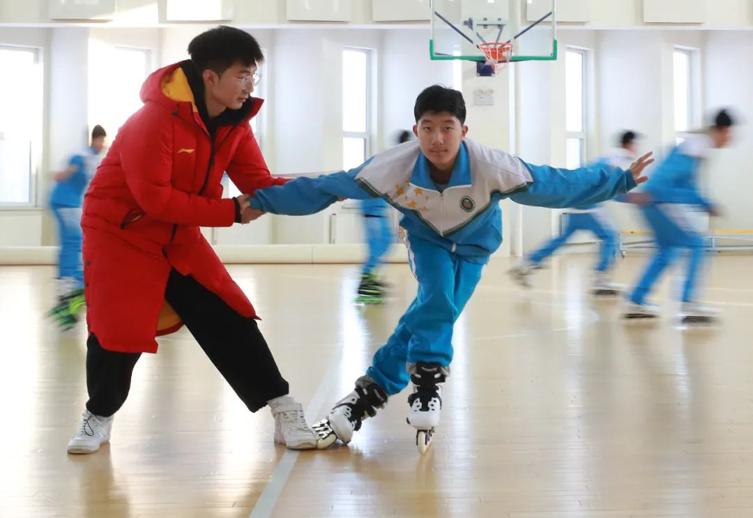 吉林长春新区东师慧仁学校体育教师逐一指导学生轮滑动作,为上冰训练做准备。资料图片
