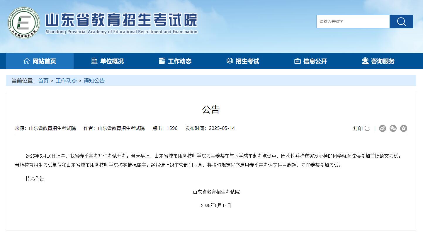 据山东省教育招生考试院消息,2025年5月10日上午,山东省春季高考知识考试开考。当天早上,山东省城市服务技师学院考生姜某在与同学乘车赴考点途中,因抢救并护送突发心梗的同学就医耽误参加首场语文考试。当地教育招生考试单位和山东省城市服务技师学院核实情况属实。经报请上级主管部门同意,将按照规定程序启用春季高考语文科目副题,安排姜某参加考试。