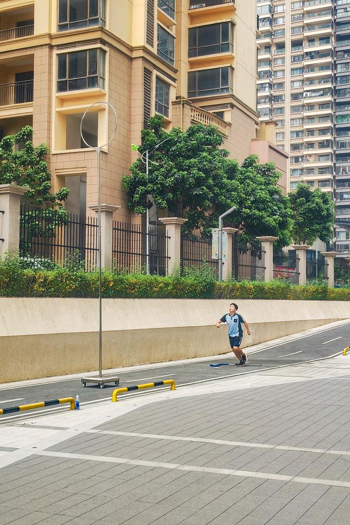 ↑在广西南宁某小区,一名初中生在进行抛绣球练习