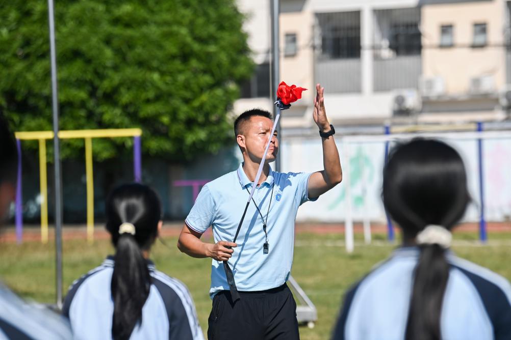 ↑在广西南宁市第三十八中学,体育老师杨国惠(右一)在讲解高杆绣球的动作技巧
