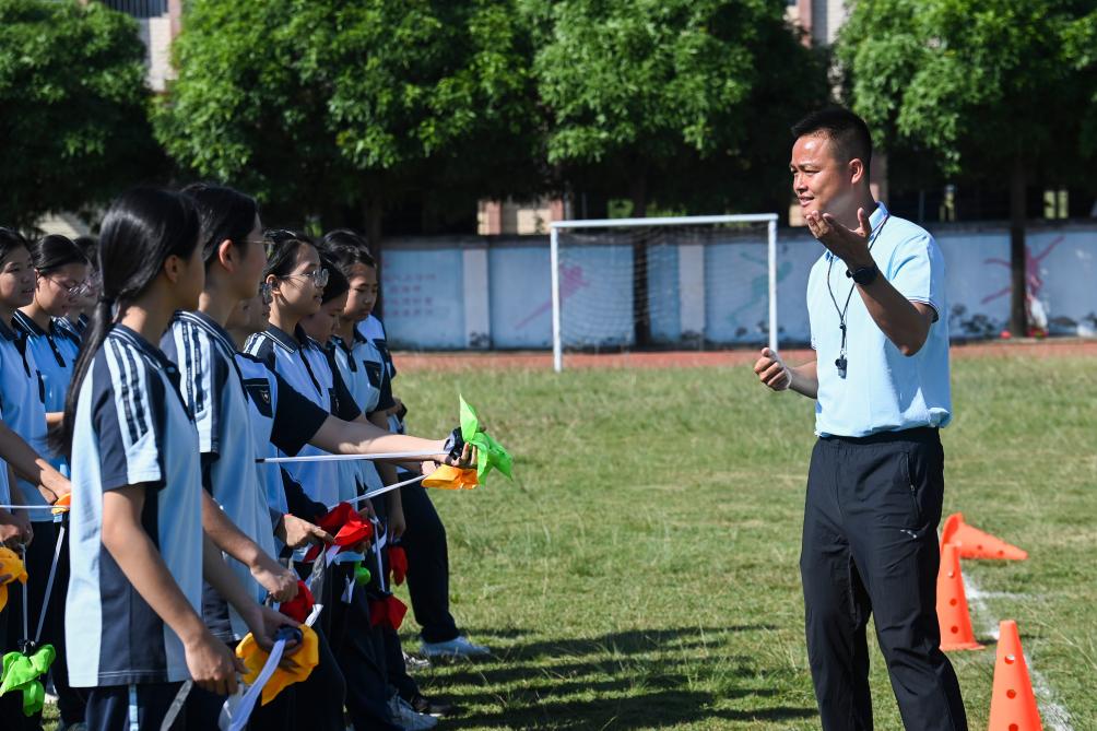 ↑在广西南宁市第三十八中学,体育老师杨国惠(右一)在讲解抛绣球的动作技巧