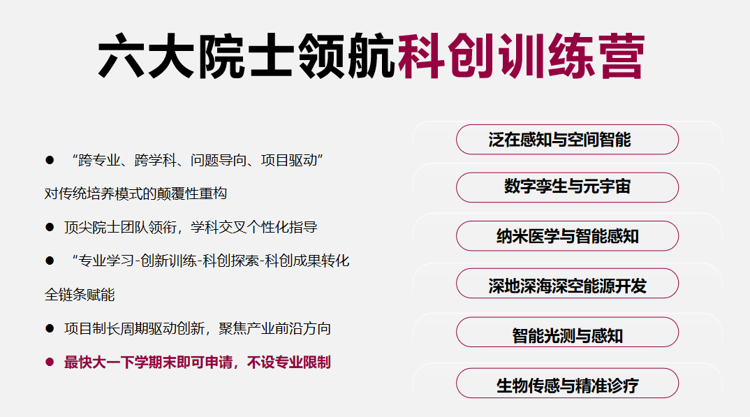 2024年,学校推出“院士领航科创训练营”,组建院士领衔的导师团队,以本科生为培养对象,采用“跨专业、跨学科、问题导向、项目驱动”创新培养模式,探索打造“专业学习-创新训练-科创探索-科创成果转化”的全新科创拔尖人才培养生态链。