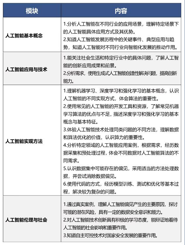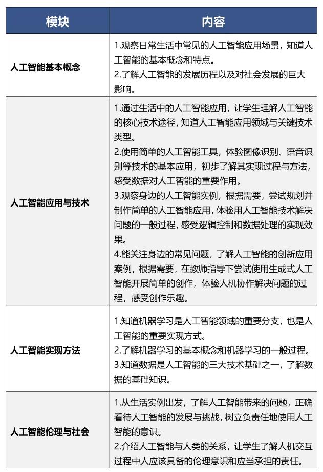 人工智能课程以全面提升学生人工智能素养为目标,面向全体学生提供人人必学、人人可学、人人愿学的基础性内容。课程包括人工智能意识与思维能力、人工智能应用与创新能力、人工智能伦理与社会责任三个方面,帮助学生从“基本了解人工智能”到“合理使用人工智能”再到“创新应用人工智能”,在人工智能项目实践中锻炼创新思维和问题解决能力。各学段将设置不同的教学目标——