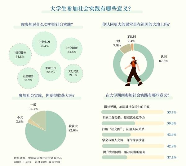 参与实地调研,开展支教服务,进入企业实习……这个夏天,不少大学生选择用社会实践作为暑假的打开方式。日前,中国青年报社社会调查中心联合问卷网(wenjuan.com)发布的一项有1000名大学生参与的调查显示,82.0%的受访大学生认为参加暑期社会实践收获大。对于参加社会实践的意义,53.7%的受访大学生认为能增长见识,加深对社会民生的了解,50.0%的受访大学生认为能积累工作经验,提高就业竞争力。87.8%的受访大学生认同,更大的课堂是在祖国的大地上。