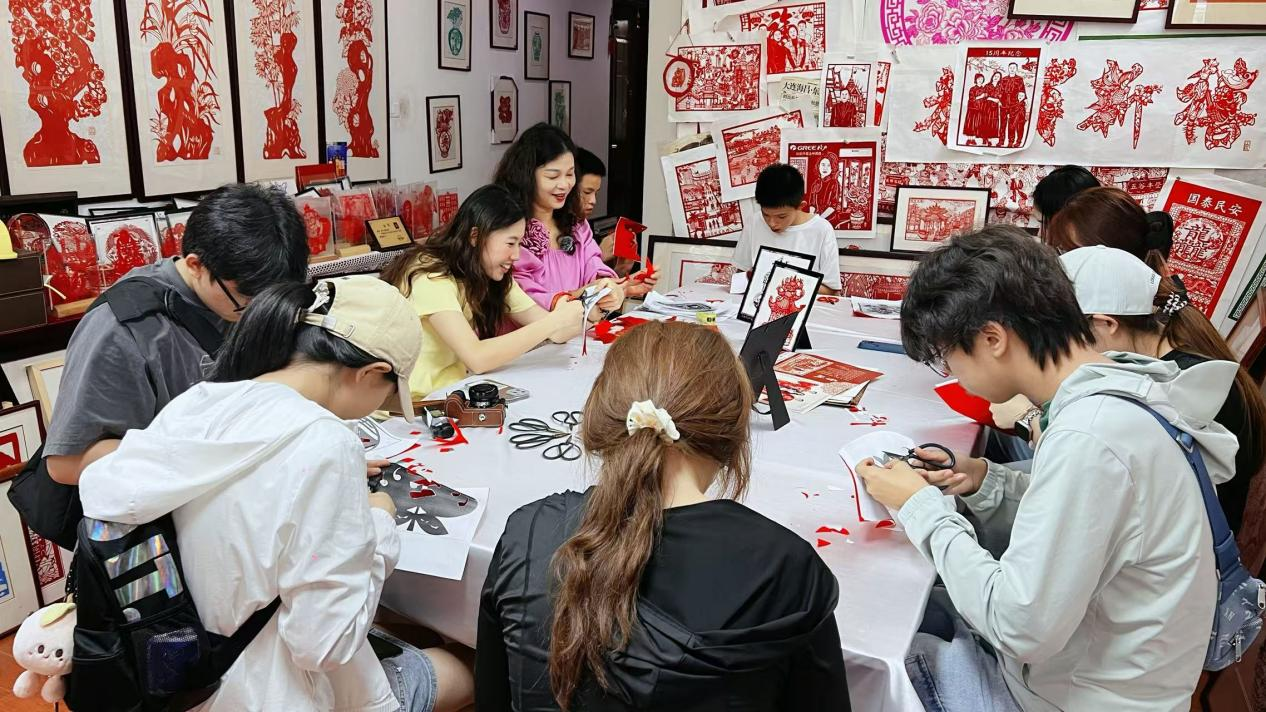 图为实践团队队员在陈小燕剪纸艺术中心学习剪纸技艺