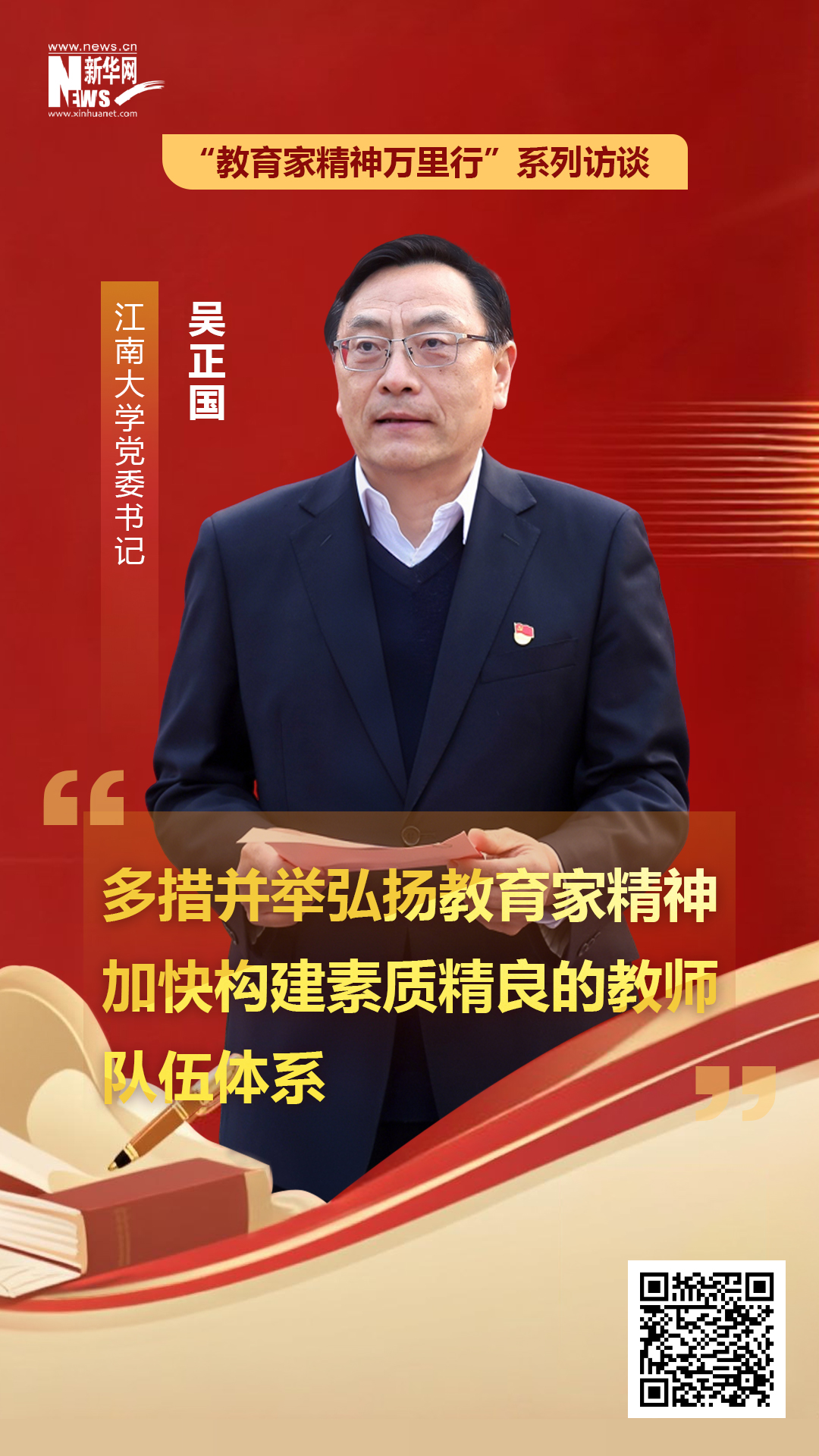 教育强国建设新征程上,为进一步助力教育家精神融入教师生涯全过程,并转化为广大教师的思想自觉和行动自觉,教育部教师工作司联合人民网、新华网、学习强国平台共同开展策划,推出“教育家精神万里行”访谈栏目,邀请教育领域专家学者和一线教师深入研讨、分享感悟,共同书写好新时代的“强师答卷”。