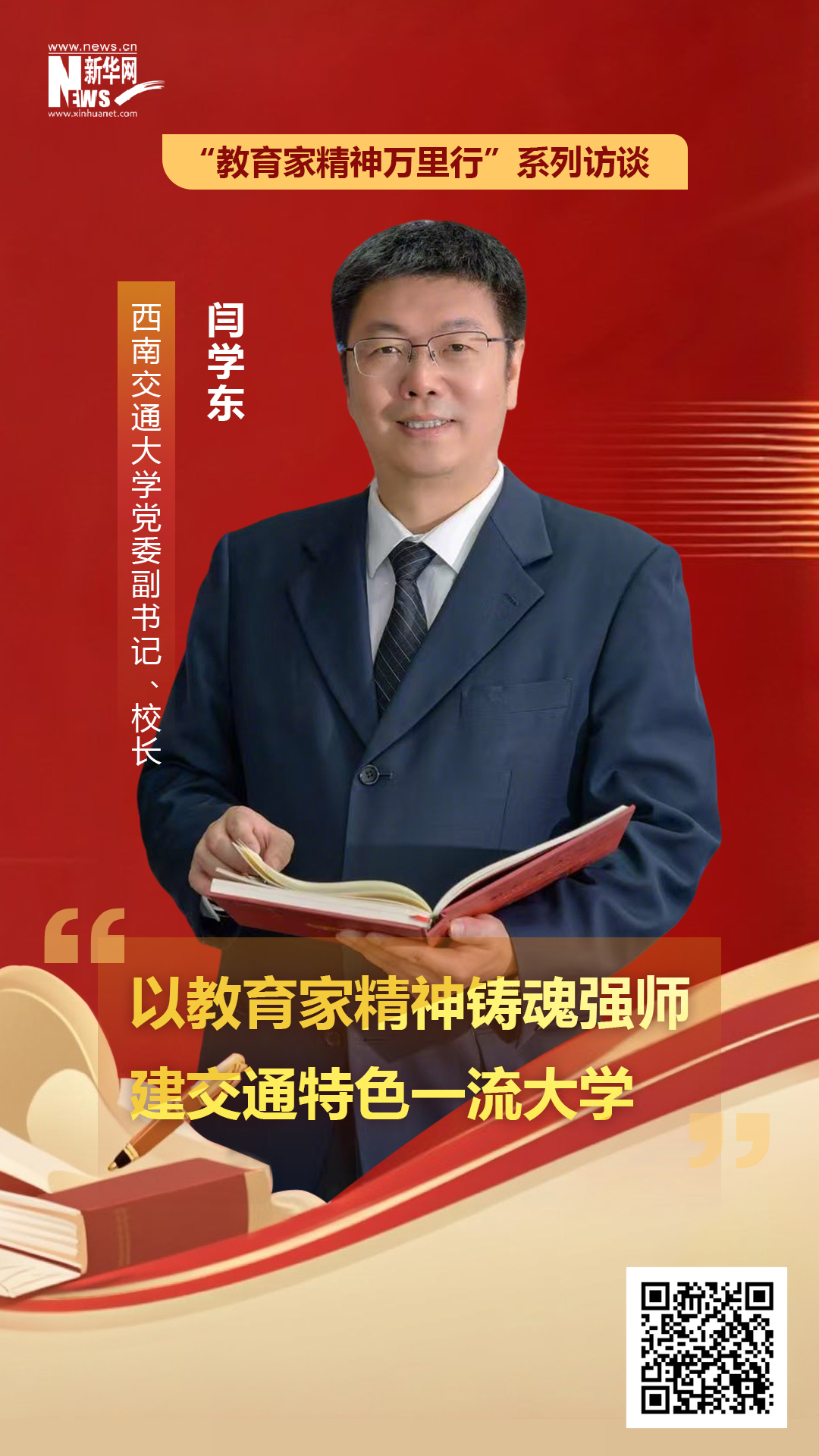 近日,西南交通大学校长、党委副书记闫学东接受新华网专访时,系统阐释了学校坚持以教育家精神铸魂强师,为加快建成交通特色鲜明的高水平研究型一流大学提供坚实支撑,努力答好新时代“教育强国、交大何为”的时代答卷。