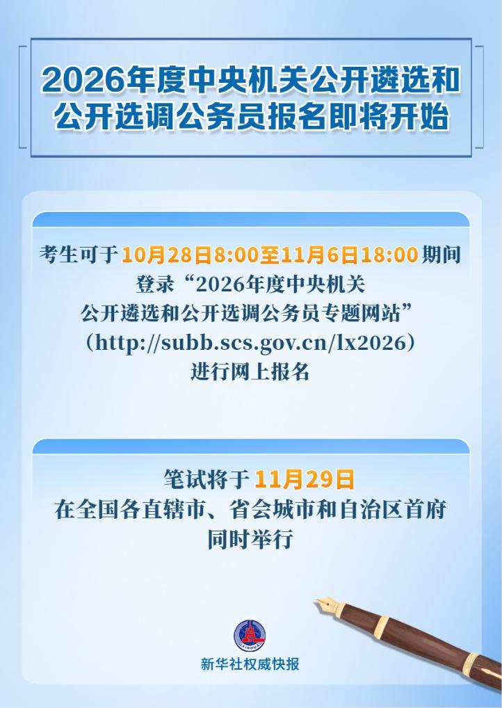 记者10月27日从国家公务员局获悉,2026年度中央机关公开遴选和公开选调公务员报名即将开始,考生可于10月28日8:00至11月6日18:00期间,登录“2026年度中央机关公开遴选和公开选调公务员专题网站”(http://subb.scs.gov.cn/lx2026)进行网上报名,笔试将于11月29日在全国各直辖市、省会城市和自治区首府同时举行。据了解,本次公开遴选和公开选调中央机关共有35个部门参加,计划选拔279人。
