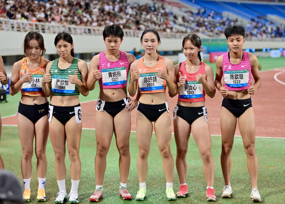 8月11日,参赛选手在赛后合影。当日,第一届全国青少年田径运动会女子100米决赛在沈阳举行。新华社记者 吴青昊 摄
