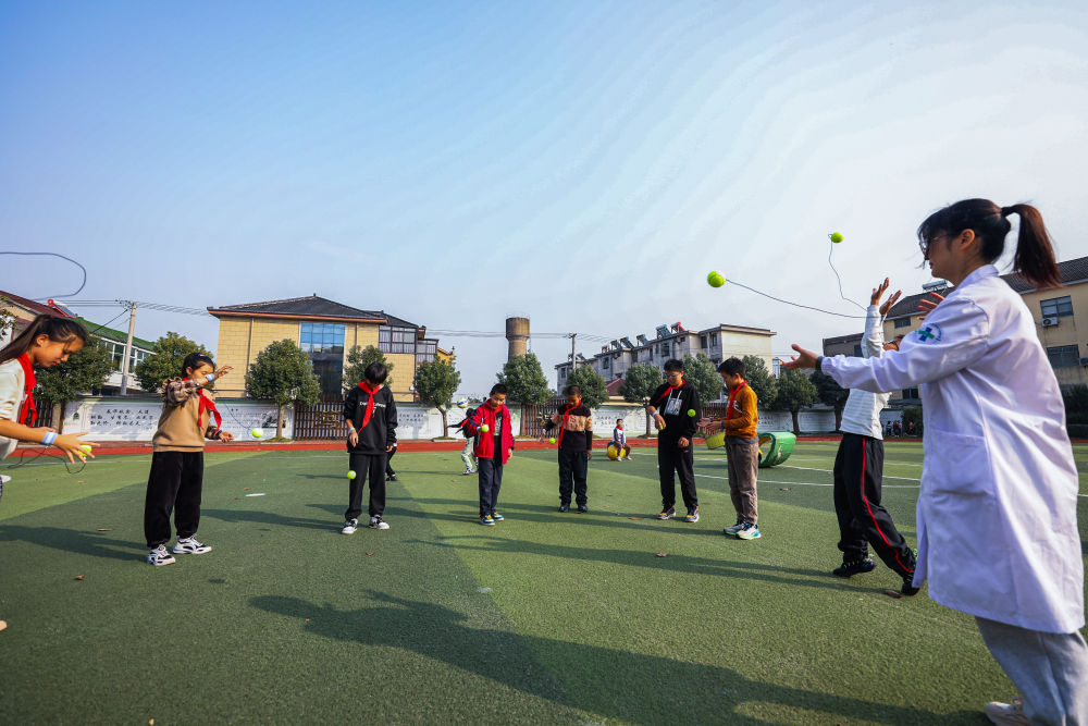 2023年11月23日,浙江省湖州市吴兴区东林镇卫生院志愿者在东林二小教导学生通过视力训练球游戏舒缓眼睛压力。新华社记者 徐昱 摄