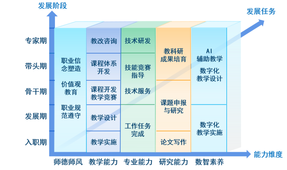 基于发展阶段理论,将教师职业发展科学划分为“入职期-发展期-骨干期-带头人期-专家期”五个阶段;对标践行教育家精神的专家型教师,构建包含师德师风、教学能力、专业能力、研究能力、数智素养五个能力维度的教师教学胜任力模型;基于发展任务理论,通过调研确定不同能力维度、不同发展阶段的19项发展任务,形成“发展阶段、能力维度、发展任务”三位一体职业院校教师教学胜任力进阶模型,为职后培养体系构建提供了理论支撑与实践依据。