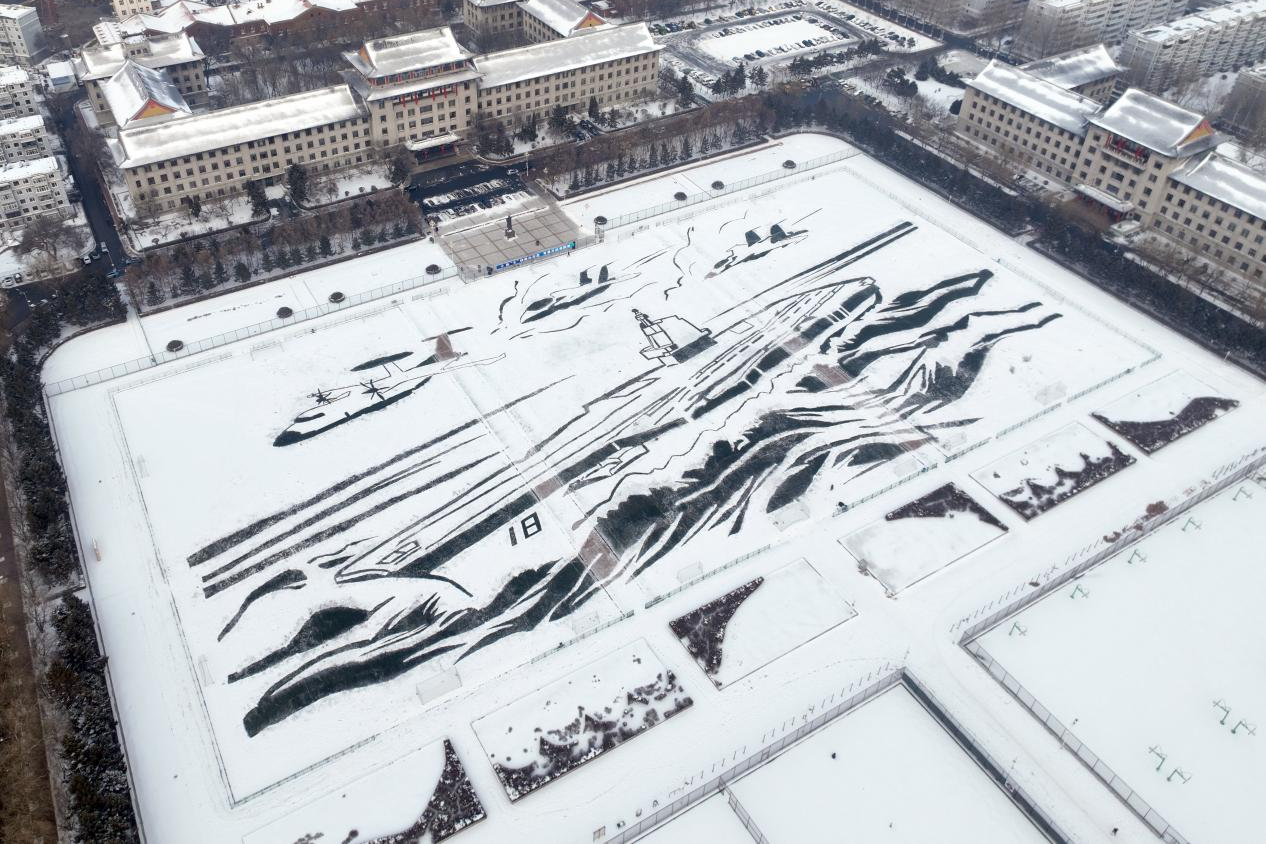 12月28日,一幅在雪地上绘制的“福建舰”航母形象,惊艳亮相哈尔滨工程大学230米长、112米宽的军工操场。这幅由1200余名师生冒着严寒共同完成的雪地“画卷”,运用先进的北斗定位技术,把学校“三海一核”(船舶工业、海军装备、海洋开发、核能应用)办学方略与黑龙江冰雪文化紧密融合,在北方的冰天雪地中致敬前沿大国重器,展现师生为建设教育强国、科技强国、人才强国再立新功的坚定决心。