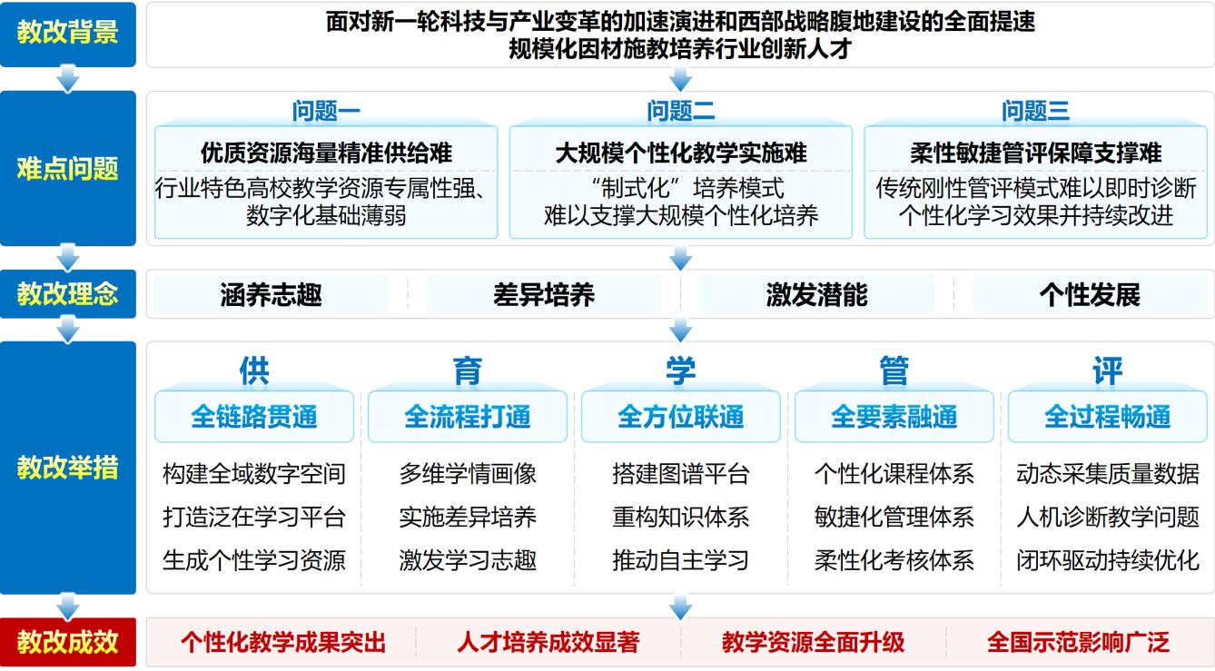 成都理工大学历经十余年探索,以数智技术为引擎,对教学“供-育-学-管-评”全链条进行系统性重构,走出了一条“数智驱动、阶梯递进”的规模化因材施教新路。