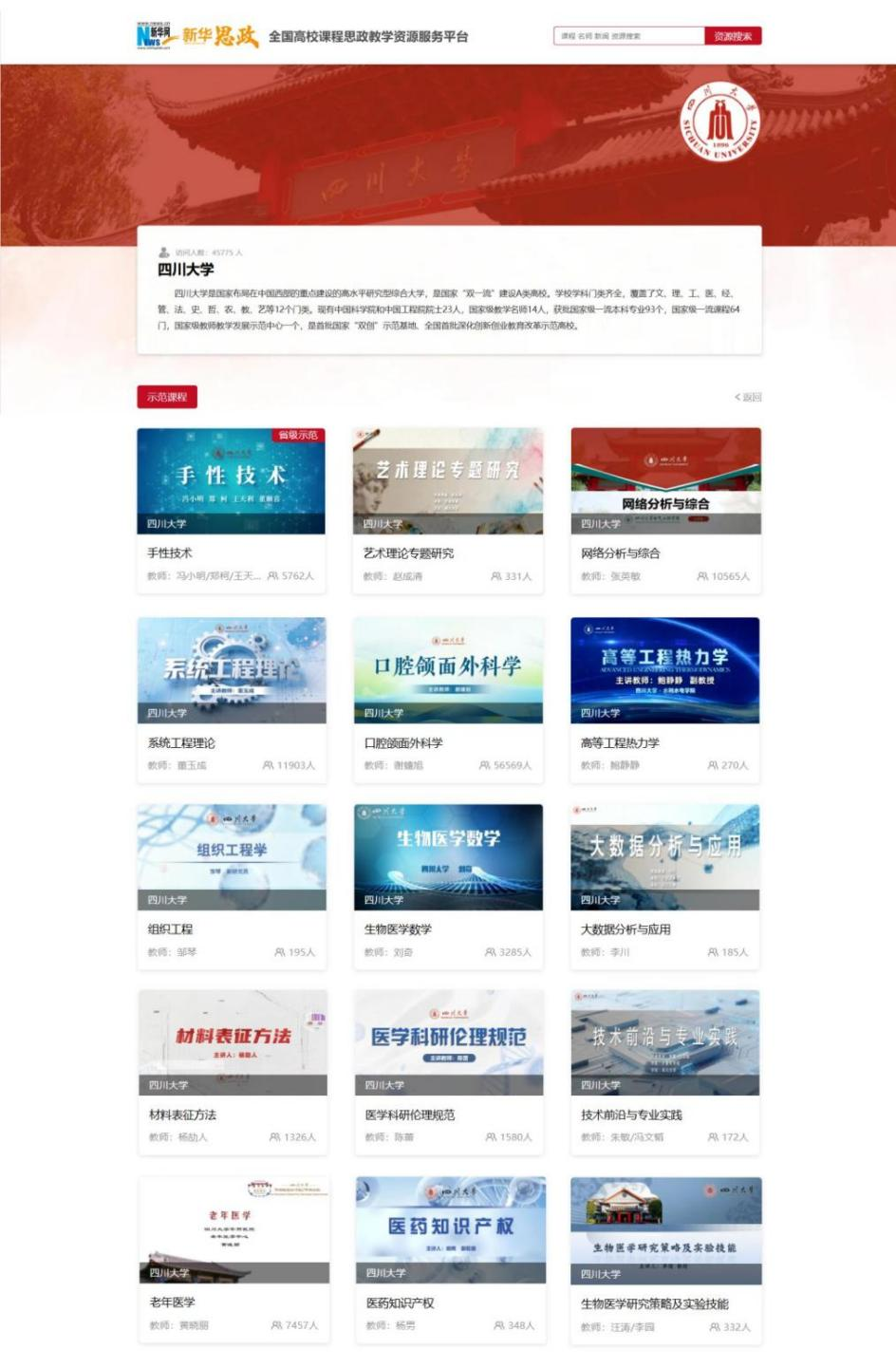 近日,四川大学15门研究生课程思政示范课程正式上线新华网“新华思政”平台,涵盖理工、医学、人文、工程等学科门类,体现了学校在课程思政建设领域的创新实践与阶段性成果。