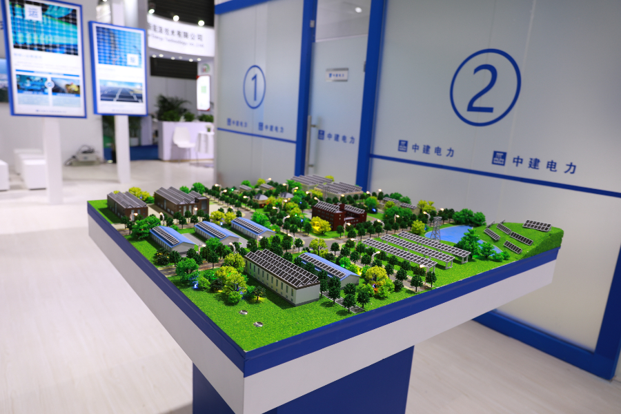 展会现场,中建电力建设有限公司的展位上,围绕在行业内首推的“融建运服”一体化服务模式,运用灯箱广告、墙体广告、光伏沙盘模型和云端运维模拟的多种展出形式。其中,光伏沙盘建筑模型尺寸为120X120CM,分为厂房模型、园区模型、学校模型、住房模型和装饰零件。现场还通过云端运维模拟“‘融建运服’一体化服务模式”,“融建运服”一体化服务模式基于解决电站项目融资难、施工质量参差不齐、运维难等问题而推出,包括安全快捷的融资服务,标准化的电站建设服务,专业的光伏运维服务及其他技术服务,能为客户提供从融资、到建设、到运维、再到创收的“电站全周期,融运一体化”服务。截至目前,中建电力建设有限公司先后承建30多个光伏发电项目,装机容量累计达800MW(兆瓦),其中20MW规模以上的项目多达18个,有3个达到了80MW规模。
