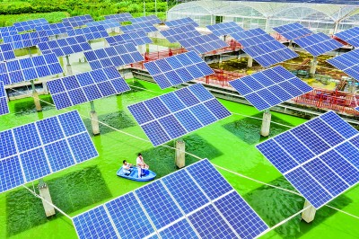近年来,广西壮族自治区蒙山县因地制宜开展“光伏+渔业”的光伏发电项目,将原先一些洼涝地、荒地打造为“渔光互补”光伏电站,改变传统的渔业养殖生产方式,实施农光互补,既符合国家清洁低碳能源发展战略,又为该县乡村振兴增添新力量。图为8月17日,工人在“渔光互补”村级光伏电站喂养鱼虾。何华文摄/光明图片