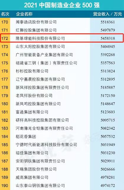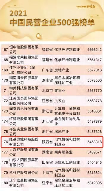 与此同时发布的“中国民营企业500强”榜单中,隆基股份位列第176位,较去年上升107位;在“中国制造业企业500强”榜单中,隆基股份位列第172位。