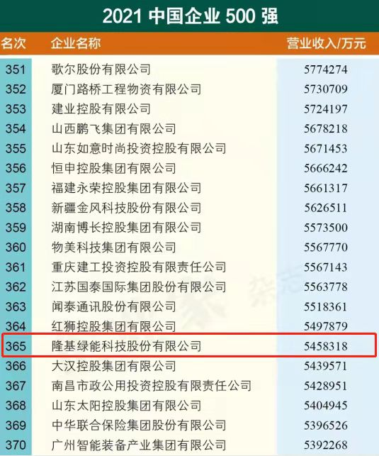 此次是中国企业联合会、中国企业家协会连续第20次向社会发布“中国企业500强”名单,榜单参照国际通行做法,以2020年企业营业收入为入围标准。隆基股份以545.83亿元营业收入首次入围,位列第365位。