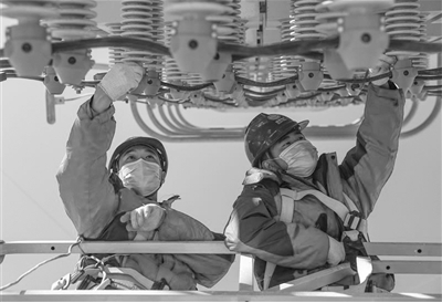 图为作业人员正在进行电容器接头紧固。 张利民摄