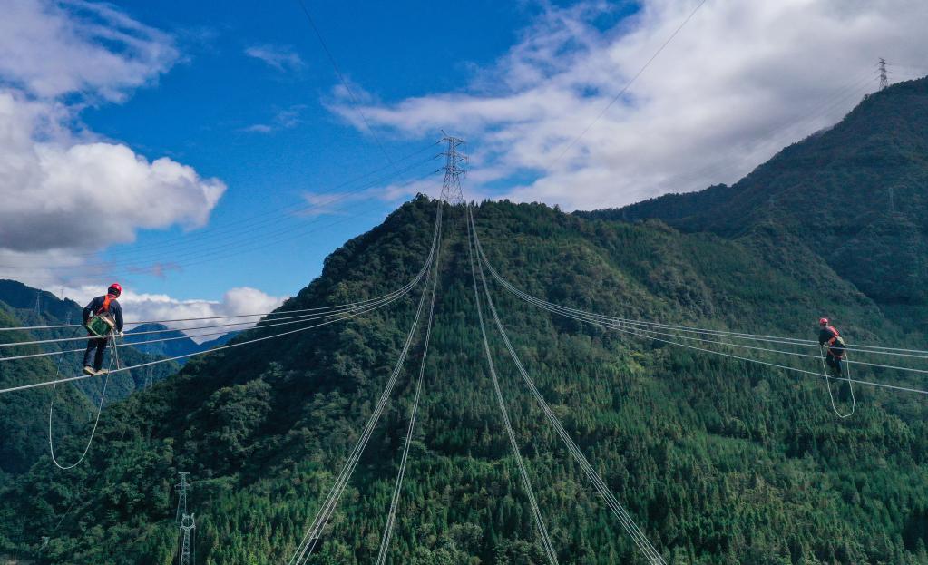 10月18日,在四川省雅安市天全县喇叭河镇,技术人员在导线上进行质检工作(无人机照片)。新华社记者 王曦 摄
