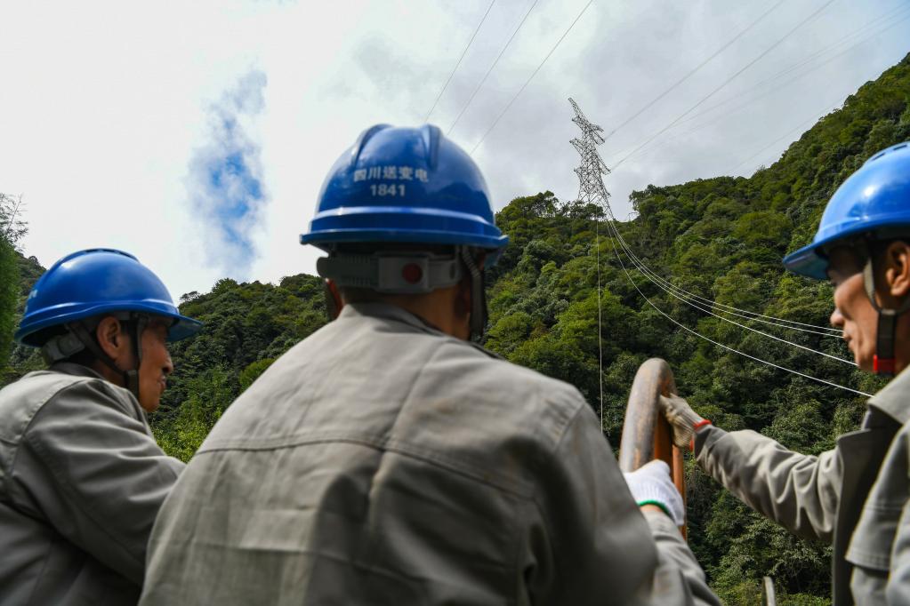 10月18日,在四川省雅安市天全县喇叭河镇,技术人员在操作驻架车回卷三级导引绳。新华社记者 王曦 摄