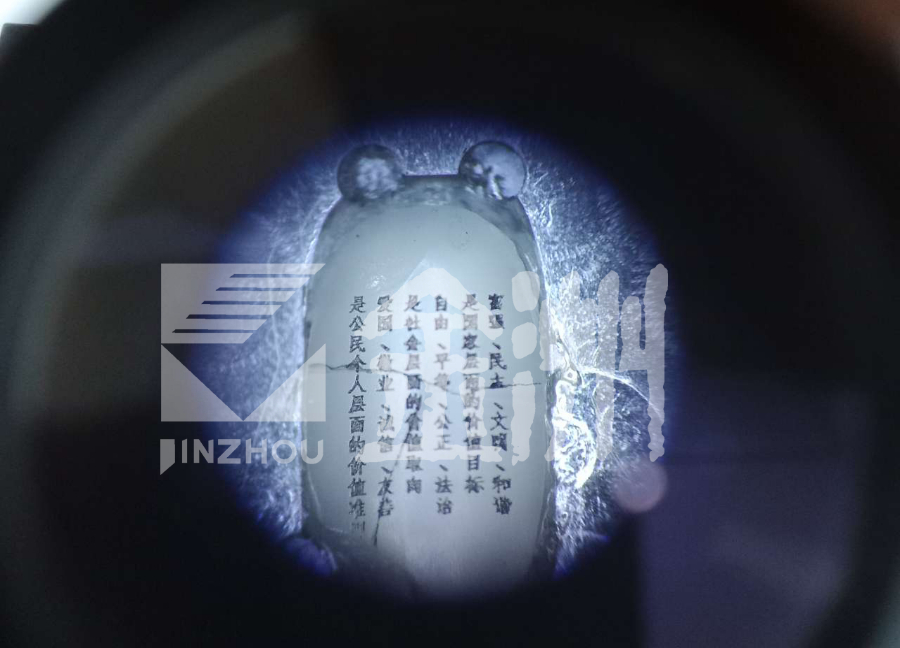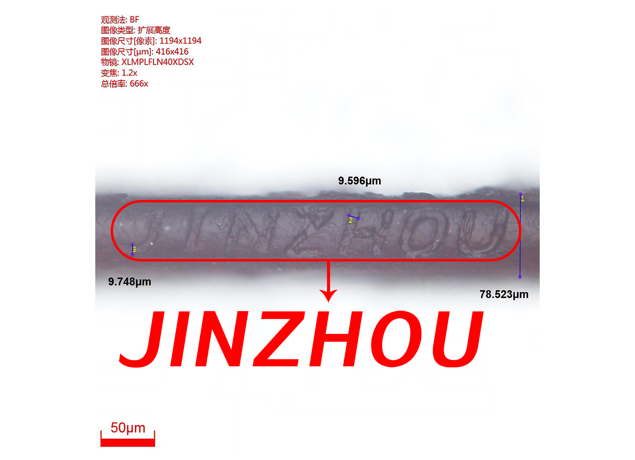 在一根头发丝上铣出完整字母:“JINZHOU”。头发丝宽度为0.078mm,"JINZHOU"字母线宽为0.0095mm。