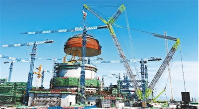 10月27日上午,我国自主三代核电“华龙一号”批量化建设首台机组——中核集团漳州核电1号机组内穹顶成功完成吊装工作,这标志着该机组从土建施工阶段全面转入设备安装阶段,也为“华龙一号”批量化建设迈出坚实步伐。图为吊装工作现场。