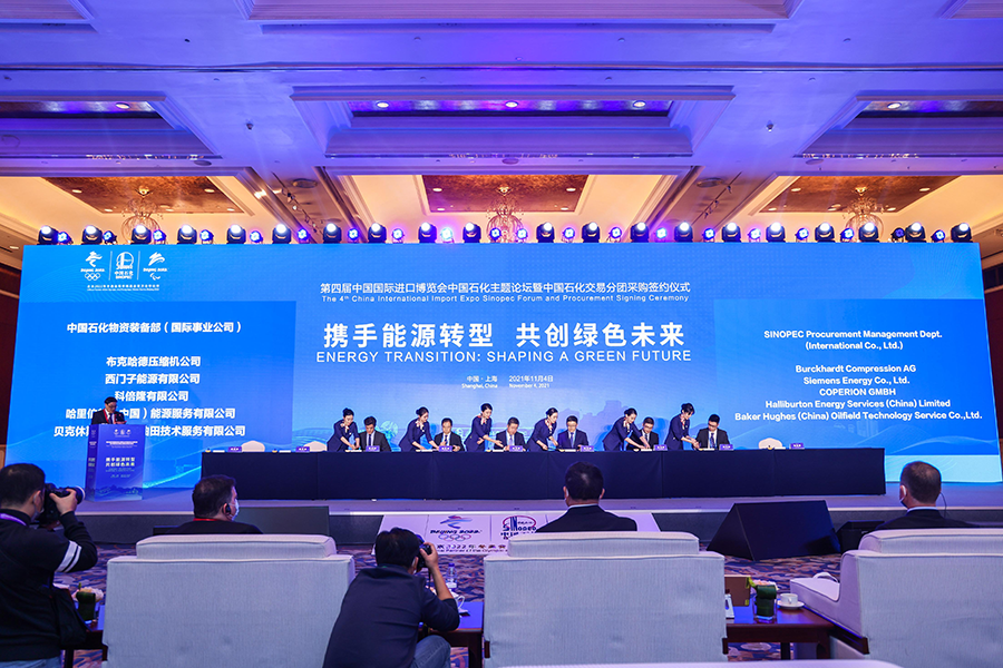 11月4日,第四届中国国际进口博览会中国石化主题论坛暨采购签约仪式在上海举办。此次论坛以“携手能源转型,共创绿色未来”为主题,旨在促进能源企业高层和业界知名专家的交流,分享对当前能源行业面临转型发展课题的真知灼见,寻求合作共创可持续发展的最佳实践。