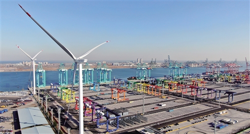15日,随着天津港北疆港区C段智能化集装箱码头北侧的两台风机叶片缓缓启动,全球首个零碳码头智慧绿色能源系统投用,并在天津港并网发电。