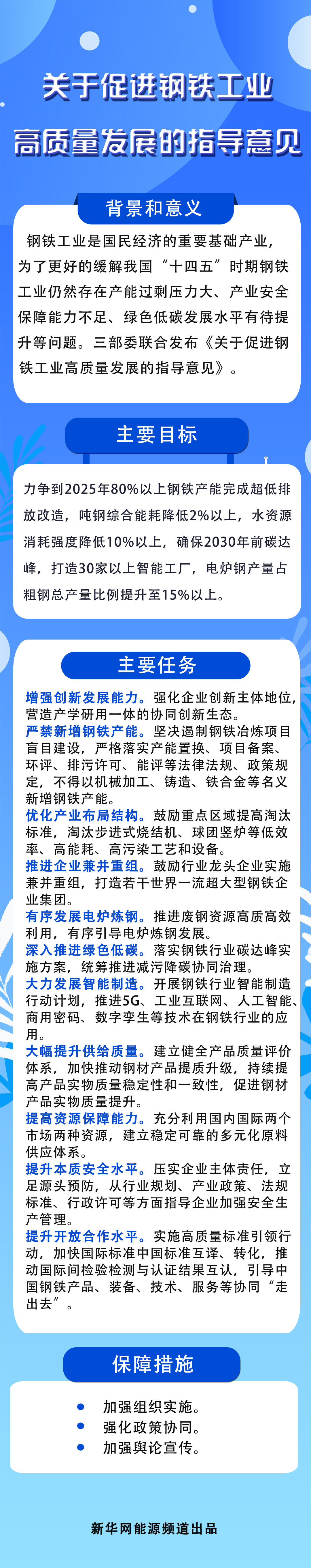 8日,工业和信息化部、国家发展和改革委员会、生态环境部三部委联合印发《关于促进钢铁工业高质量发展的指导意见》,意见明确提出,力争到2025年,钢铁工业基本形成布局结构合理、资源供应稳定、技术装备先进、质量品牌突出、智能化水平高、全球竞争力强、绿色低碳可持续的高质量发展格局。