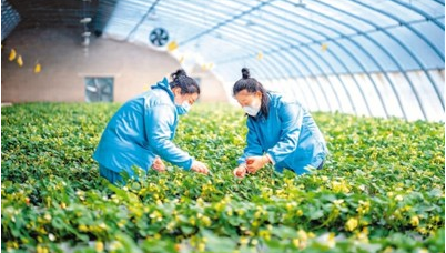 河北正定县近年来着力打造智慧生态设施农业。本地农户按订单生产,标准化种植,收获后在车间制成净菜,通过便民直营店和社区配送的方式,将“安全、绿色、无公害”的食品送到市民餐桌上。图为2月12日,正定县新安镇吴兴村一家农业科技公司的员工在管护水培草莓。武志伟摄(人民视觉)