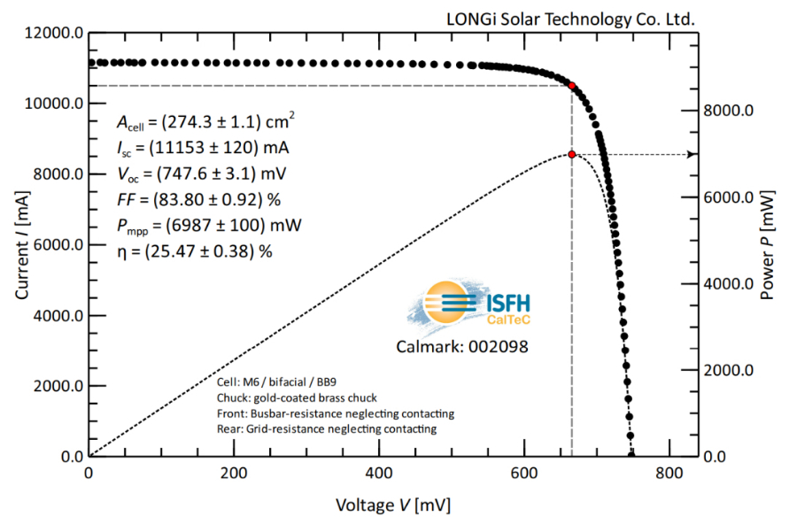 近日,经德国哈梅林太阳能研究所(ISFH)认证,隆基采用掺镓p型硅片制备的硅异质结电池(p-HJT)获得效率新突破:完全利用可量产工艺在全尺寸(M6尺寸,面积274.3cm²)单晶硅片上,创造了转换效率为25.47%的大尺寸p型光伏电池效率世界纪录,进一步验证了低成本异质结量产技术的可行性。