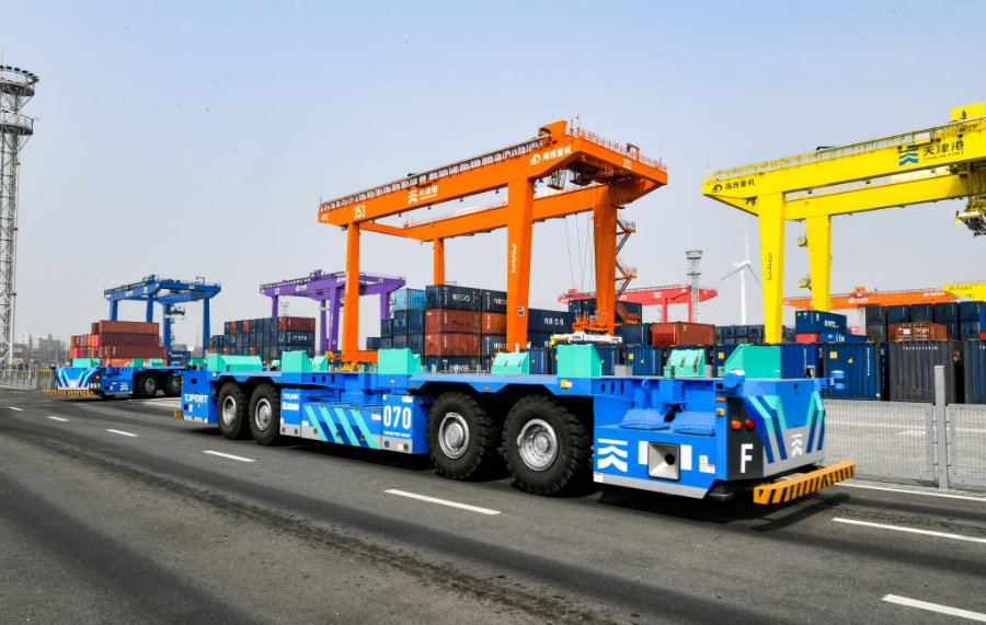 4月9日,这是在天津港北疆港区C段智能化集装箱码头拍摄的智能水平运输机器人和智能解锁站。新华社记者孙凡越摄