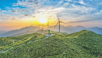 近年来,地处赣闽边界的江西省抚州市广昌县积极推进生态保护、封山育林和绿色产业发展,截至目前全县森林覆盖率达70.24%。图为5月4日,在广昌县塘坊镇,连绵群山和一排排风电机组沐浴在朝霞中,呈现出一幅优美的生态画卷。 曾恒贵摄(人民视觉)