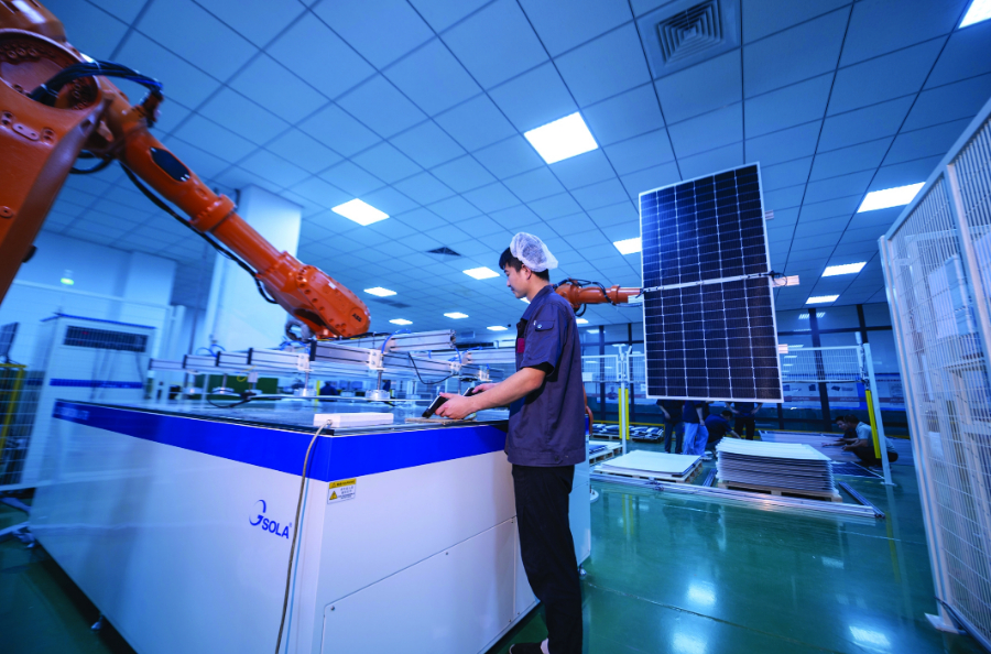 江苏省扬中市地处长江中下游,光伏产业在其新能源产业中占比达65%,是名副其实的“光伏产业岛”“中国太阳岛”。图为扬中市油坊镇上迈新能源科技有限公司生产车间,工人正在生产一批出口欧美的太阳能光伏电池组件