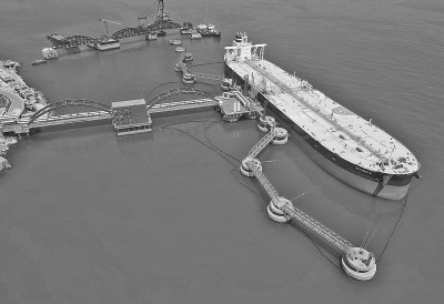 日前,山东港口烟台港原油管道复线(干线)正式启输。该项目从烟台港西港区出发,直达东营输油站,全长370余公里。该管道与原有的烟台至淄博长输管道形成“双管齐下”的新布局,输送能力由原来的每年2000万吨提升至4000万吨。图为7月8日,在烟台港西港区30万吨级原油码头,一艘油轮通过原油管道卸油。唐克摄/光明图片