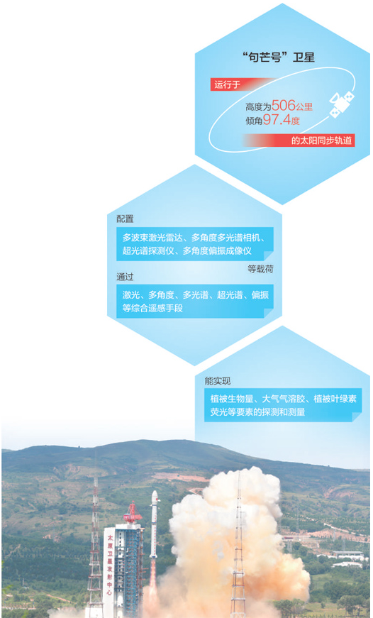 中国航天科技集团五院遥感卫星总体部“句芒号”卫星总设计师曹海翊介绍,“句芒号”卫星是国家民用空间基础设施中长期发展规划中的科研卫星,运行于高度为506公里、倾角97.4度的太阳同步轨道。通过激光、多角度、多光谱、超光谱、偏振等综合遥感手段,能实现植被生物量、大气气溶胶、植被叶绿素荧光等要素的探测和测量。