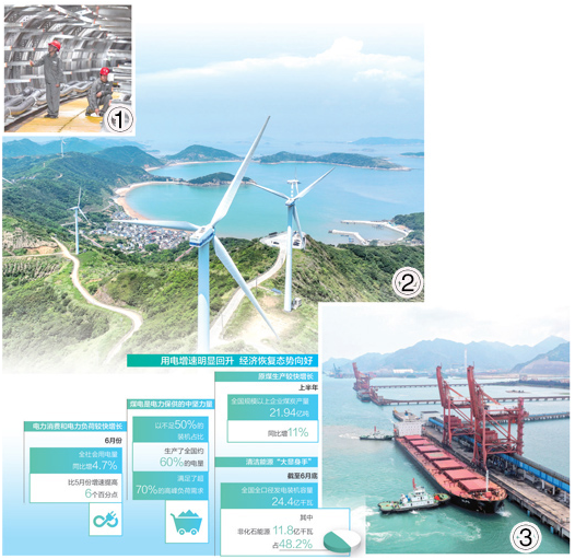 图①:8月4日,在湖南省长沙市万家丽路电力隧道内,工作人员在检查电缆。长度约14公里、平均深度36米的地下空间里,新建的万家丽路电力隧道已有多条供电线路完成电缆铺设并投入使用。新华社记者 陈泽国摄 图②:8月6日,浙江省舟山市岱山县大衢岛,风电机组不停转动,源源不断地把绿色电能输入国家电网。姚 峰摄(影像中国) 图③:7月28日,福建省福州市连江经济开发区码头,一艘满载煤炭的货轮正在靠泊。谢贵明摄(影像中国) 数据来源:国家能源局