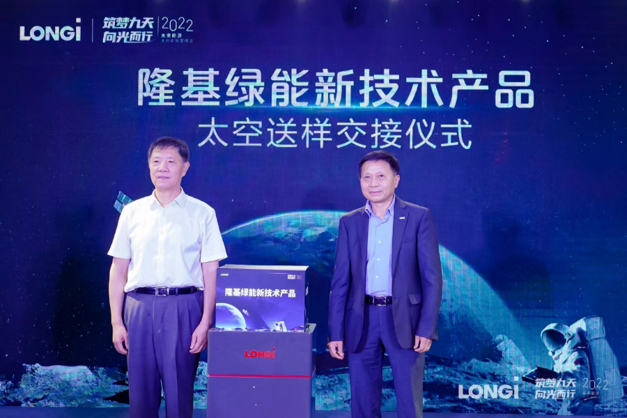同时,作为未来能源太空实验室成立之后的首个重大项目,隆基的新技术产品将申请进行太空搭载,接受严苛的太空环境考验,探究新产品在太空环境的可靠性。结合太空搭载的实验结果,通过地面模拟外太空的实际环境,监测该产品相关性能的变化,为推广该产品的实际应用奠定理论和实验基础, 拓宽产品的应用领域。这将是隆基绿能首次将产品与航天领域结合,也是隆基绿能为提升产品性能、验证产品可靠性的全新探索升级。在现场,隆基绿能中央研究院副院长徐希翔博士将计划进行太空搭载的新技术产品进行送样。