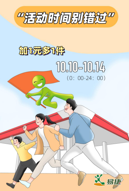“加1元多1件”活动从10月10日零点开始到10月14日24点结束。