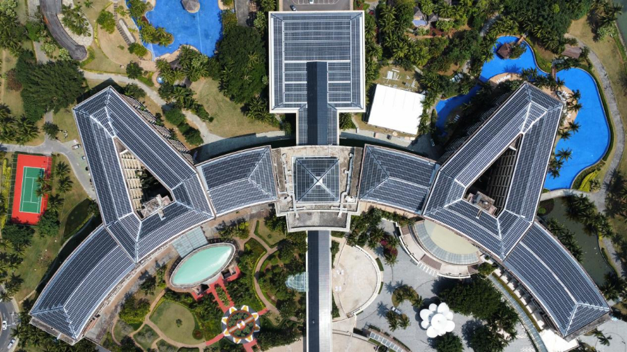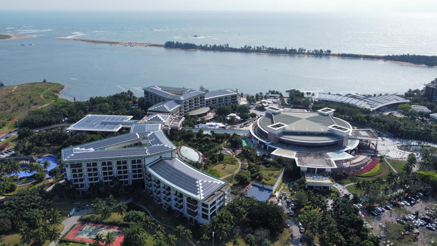 于是,在岛内亚论酒店、新闻中心、停车场等可利用的屋顶、空地上,一块块光伏组件产品成为这些地标建筑的“新外衣”,源源不断地为博鳌亚洲论坛提供重要的绿电供应和保障。