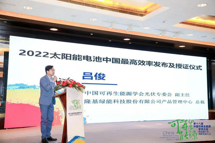 中国可再生能源学会光伏专委会副主任、隆基绿能产品管理中心总裁吕俊博士进行《2022太阳电池中国最高效率》发布。