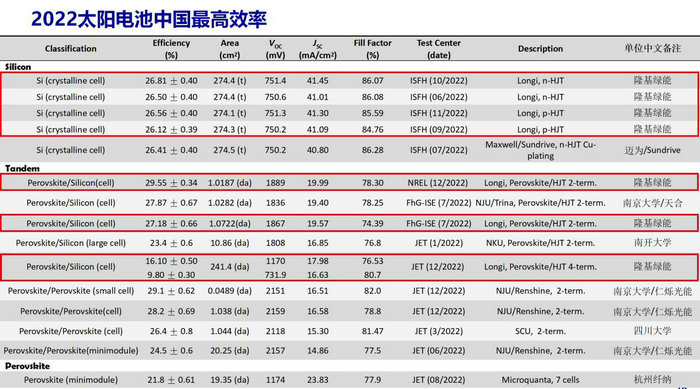 2022太阳电池中国最高效率发布,隆基绿能共有7个电池效率入选,占此次效率结果发布的近1/2。