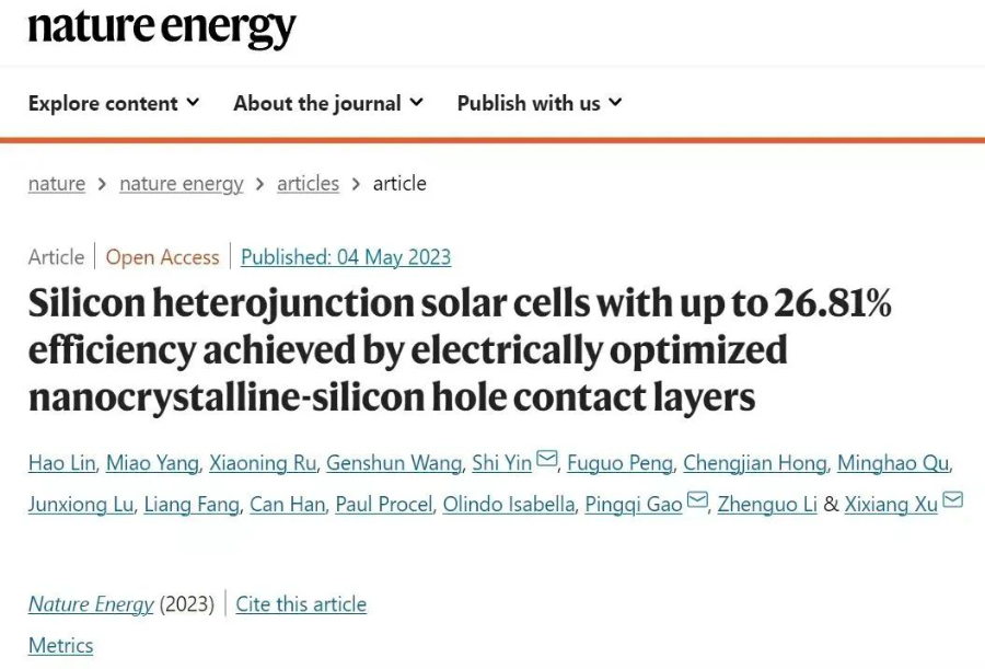 近日,隆基绿能自主研发的晶硅异质结电池创新技术研究成果,在世界顶级材料科学领域学术期刊《Nature Energy》上发表。虽然该新型电池所需材料95%与当前已有的晶硅电池相同,但其效率更高,达到26.81%,是目前全球所有技术路线晶硅太阳能电池效率的最高纪录。