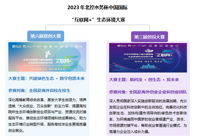 目前,北控水务杯第六届中国国际“互联网+”生态环境创新创业大赛(以下简称“双创大赛”)和第三届中国国际“互联网+”生态环境科技创投大赛(以下简称“创投大赛”)两场赛事报名通道已在北控水务集团官网(http://www.bewg.net/)正式开启,报名截止日期为2023年10月10日,并拟定于12月初在南京大学举办现场总决赛。